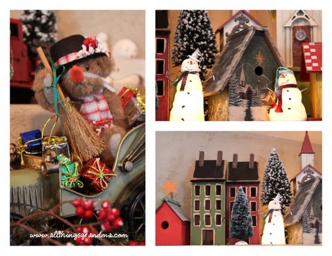 I wonder why we love what we do?  Why we are pulled toward certain things . . . colors . . . styles.  I love Christmas “all through the house”.  I love digging out the Christmas boxes and re-discovering years of treasures.  Familiar treasures.  Our mantle  is a village.  Not a village of little houses and people but an “over -sized” village with houses which are mostly birdhouses.  There are snowmen and trees.  Old metal cars and trucks.  Even a little bear who thinks he is fooling everyone by dressing as a snowman.  Each year, as I unwrap our Christmas treasures I think about where they came from and when.  About why there is sentiment attached to some treasures and just plain love attached to others.  I think that our collections of Christmas things . . . whether big or small . . . are filled with our personalities.