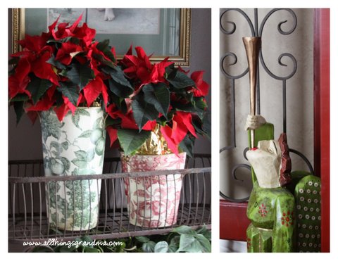 Every year I put something in these tin buckets.  This year it is poinsettias.  Last year it was Paper Whites.  New this year are the red shutters and the very tall folk angel.  From the floor to the top of her horn is about three feet.  She is wonderful.  Christmas is so calming and comforting. These are just a few of my favorite things . . .