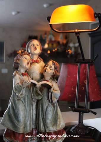 The carolers sing from the top of the piano.  The mantle is behind them.  The carolers are among my favorite Christmas keepsakes. I especially love to put a soft light on their faces.  They seem so angelic.
