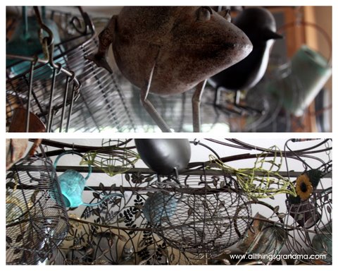 I don’t know why I am drawn to the things that I am. But, I am. Two of my weaknesses are on display in my kitchen above the counter. Watering cans and wire baskets. Not all watering cans call to me. I like silver and bronze and brown. I like shapes. Different shapes. The bird is a watering can. The frog is too. Some of the cans are very small. Some middle sized and some big. I never use them to water anything. They are just to look at. I guess that is what collections are. Similar things to look at.