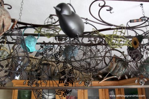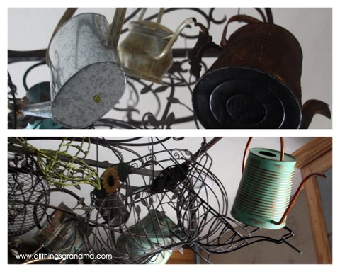 Next I admit to a fascination with wire baskets. Yes, I know. They are everywhere. But not every basket catches my eye. These do. Hung together with the watering cans, the baskets are interesting. Since they are baskets . . . you can see right through them. Nothing blocks out the light.