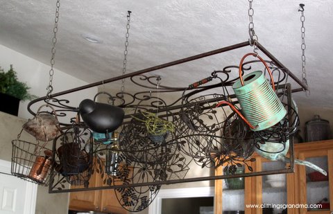 The homemade baker’s rack is one of my favorite things. I couldn’t find anything I could afford that looked the way I wanted it to. So, I did some thinking and prowling around. I found this wonderful piece of wrought iron in a garden shop. It stretches the entire length of my kitchen counter. It is about thirty inches wide. Since the ceiling is pitched, Grandpa had to use his mathematical hat to figure out the chains. He put the hooks into studs for strength. When I first put it together, I hung a long, rectangular piece of stained glass underneath. It let the light through. It contained hummingbirds. One day we came home and it had fallen. Broken. I bought it for $35 thirty-five years ago and carted it around from house to house. Then, one day, we were walking through an outdoor market where I spotted the piece with the stems and leaves. It was the exact color and texture and length to replace the glass. Ahhhhh. Better.