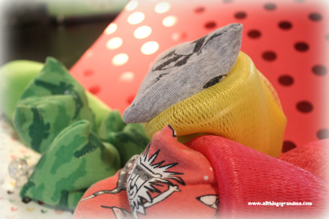 Below are a couple of variations on the socks. Puffy soap holders with drawstrings work as things to throw, as long as you sew them closed and any children’s knit onesie can be cut apart to make little rice bags.