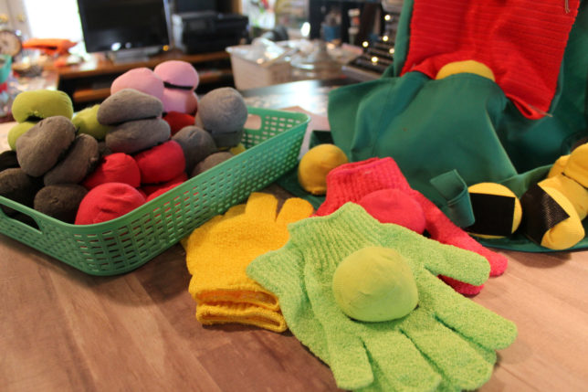 The gloves are those “skin care kind” which are very rough. They are usually a dollar a pair. Indoors or outdoors, the balls stick to the gloves and provide hours of fun. You can color-coordinate the balls and the gloves if you want to keep track of who is in trouble.