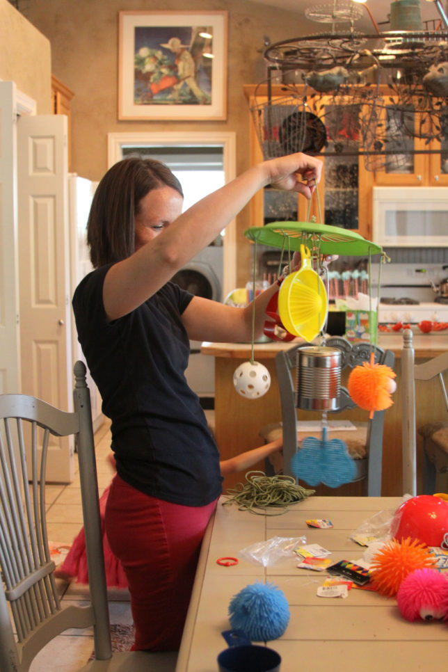I saved cans in different sizes in advance of the activity, washed them and asked Grandpa to drill a hole in the top of each one. The cans make a noise against each other and against other things. Plastic makes a soft clicking sound in the wind. Hummingbirds are especially curious about anything you hang up.