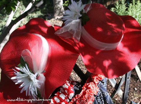 As a grandma, I wonder about other grandmas. What they do and think and how they get by. Some grandmas have what they need. Some have a little extra. Some have a lot extra. Most have what they need and the creativity to make money stretch and figure things out of other things. Grandma’s generally have to be careful with their money, so, when I want to do something fun, I prowl the dollar stores and bins first. These bright and happy hats were just $2.50 in the discount bins as you walk into a Target store. They are fun and floppy. I brought them home, tied some soft net around them and added a flower. I already had the flowers in a bunch. I just cut off the flowers I wanted with some wire cutters and wrapped the stem with brown florist tape. Then I just stuck the flower into the net. Tomorrow these dress-up hats and two red, white and blue 4th of July skirts will be resting in a box on its way to two, little “dress-up” girls. Grandmas don’t have to spend a lot of money, but they have to pay attention to what their grandchildren like. Right now, FUNKY is the style. So, almost anything goes. Except at Church ! Really . . . except at Church !
