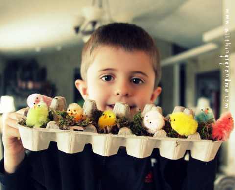 Holden made this “chick holder” a few days before. { That’s what he called it } He glued the moss inside of each egg cup and then added the fuzzy chicks. He has always had a thing for “fuzzy chicks” and checks with me every year to see if I have bought them yet.