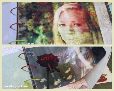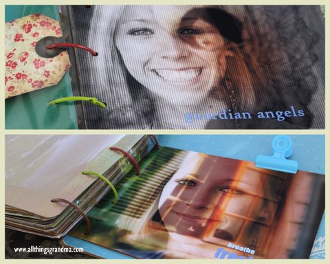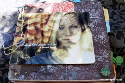 This is my granddaughter’s journal. She may have other journals but I wanted to make one that was unique . . . just like her. I gathered odds and ends. I measured and punched and edged with lamination to keep the pages strong. I mixed colors and shapes and textures. Every few pages I added her face. Her face with something else to make a point. A point about who she was.