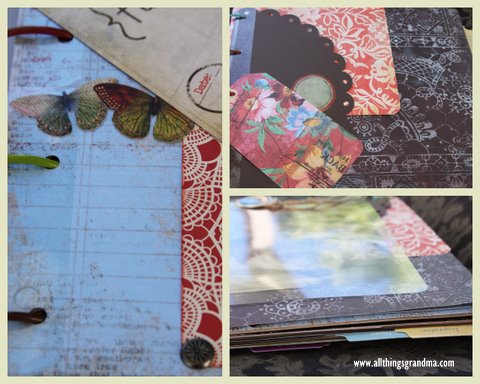 No, I didn’t run to the store for the supplies for this journal. I went through everything in my creative space until I had found a blend of colors, textures and styles. Then I just started putting it together. At first, I was going to bind it. Then I thought that if I used big rings, pages could be added and subtracted. Of course a journal is private. I put this one in a square box. 12×12. That should keep it safe from curious eyes and I don’t mean the dog.