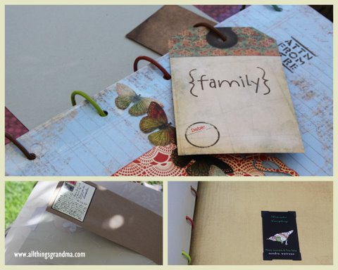 Every page is different. Each has room to write and to glue photographs. Some pages have envelopes to tuck things into. There are practical pages and impractical pages. There are tags and folders and words and lines and pages which are stamped and some which are punched. There is strong paper and see-through paper.
