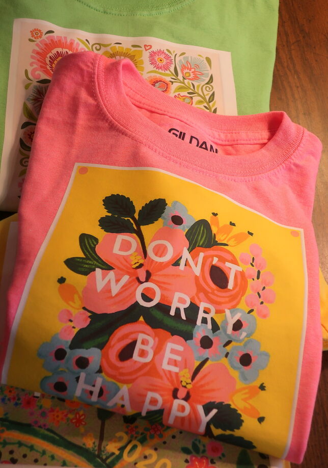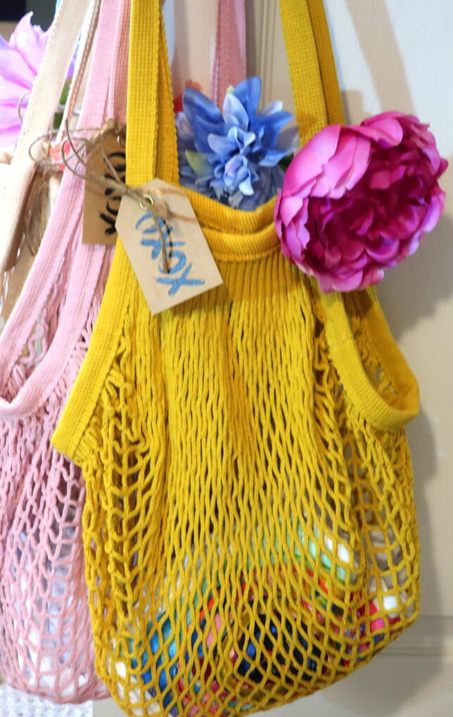 Oh, I loved these little crocheted beach bags when I first saw them. I bought one for myself . . . a mustard-colored one and clipped a large pink flower on it. Because I loved it so much, I kept thinking about it. I thought and thought until I thought about buying one for each of the girls to hold their Family Gathering T-Shirt and that is just what I did.