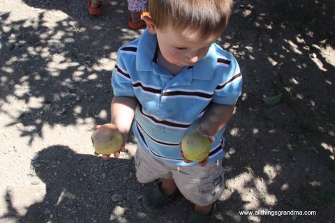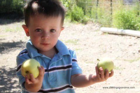 I wonder what little children think when suddenly food is outside . . . is on the ground and under the ground. When apples literally fall from the trees? Autumn is the most wonderful time of the year for children. They can eat things they pick themselves. They can pick little tomatoes and pop them in their mouths. They can pull up carrots. They can reach for apples and pears. They can even eat peaches. Grandpa knows how to take the skin off and break the peach in half. Outside. Right outside. Children can pull up onions and load them into Grandpa’s wheelbarrow.