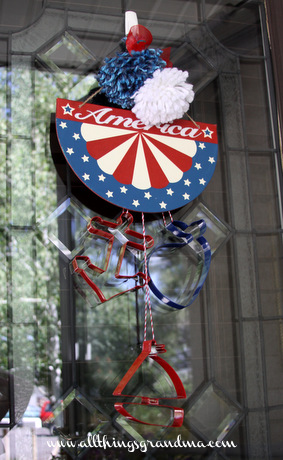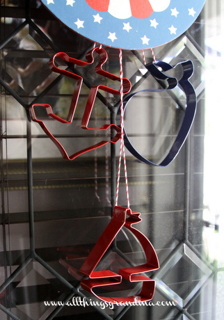 The “America” plaque came from Dollar Tree. The over-sized cookie cutters came from Michael’s Crafts and were $1.50 each. I already had the twine which I used to hang the cookie cutters. ( I never buy twine at the scrapbook store or on the scrapbook aisle because it is too expensive. I buy it on a roll at Hobby Lobby at 50% off. It is with the ribbon and goes on sale every other week. It is 20 yards to a roll for $1.50 when on sale. )