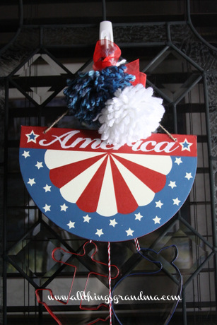 I made a bunch of red, white and blue yarn pom poms for a garland which is just about finished and so . . . I used two for the top of the decoration.
