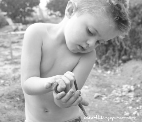 I don’t think this is a worm. I think it is a poisonous snake. It is just too big for a worm. Holden never met a worm he didn’t know. He talked to them like they were old friends. He asked them how they were and where they wanted to go. He asked them if they were hungry or if they needed some water or some grass to crawl in. For all I know, he had talked to this worm before . . . when it was just little. Actually, this worm-snake was under the tether ball pole. Grandpa rolled the tire holding the pole and underneath was another world. There were centipedes and potato bugs and worms of all sizes. This, however, was the prize. I asked Holden what he was going to do with the worm. He said he was thinking about it. I was thinking about it too.