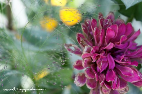 Now I know that there is a hidden world which can only be appreciated through a macro lens.  I am not one to take many pictures of things without people.  Just seems like down the road those pictures won’t matter.  Much of the time I take pictures from nature for Grandpa to paint.  He is a watercolor painter.  My eyes thought they were seeing one thing but my camera . . . a Canon 50D with a Canon 100 mm macro lens was seeing something else.  It is simply wonderful.  During the years of raising children it was hard to spend on anything except the basics.  I had to grow older to see that it is possible to save for things one doesn’t need.  Like a macro lens.  It is nearing the end of the season.  Already the flowers are getting a little sad looking.  The best part of this photograph to me is the grass next to the fading zinnia.  Look how the lens picks up the delicacy of the strands and the color on the ends.  I couldn’t see either before I took the photograph.  Oh, my.  What a beautiful world.