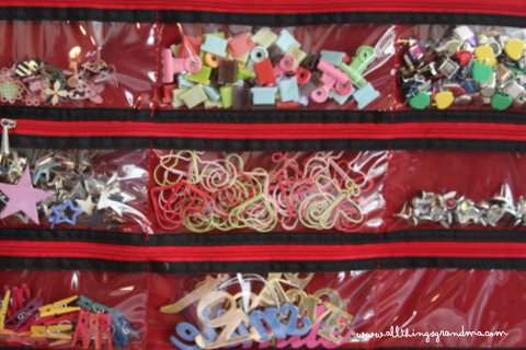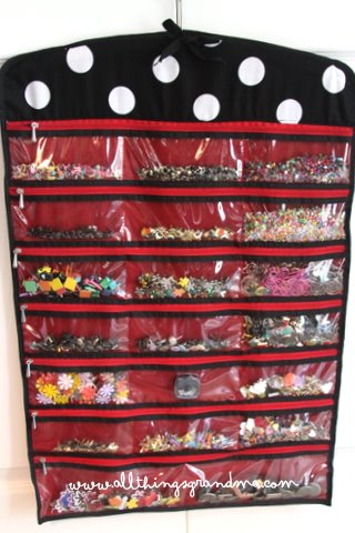 This is scrapbook jewelry. It just keeps getting better and better. Keeping it in sight is another matter. At first I used tiny, individual, see-through plastic jars for each type of “embellishment”. When it became apparent that I would have to stack the little jars on something and move the first row in order the see the back row . . . I began to think again. I found this fun “real jewelry” keeper at TJ Maxx. I liked it because everything can be closed with a zipper, it had lots of separate compartments, it easily hangs on a door or handle and it has the same things on both sides. I was able to put every little tiny thing into one place without stacking or moving anything. Just ZIP . . . and UNZIP. Nothing to spill (unless little people get into it), but even that is easier because there are no lids to mess with.