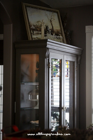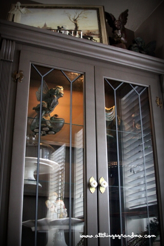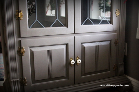 As he always does with his projects, Grandpa took it into the garage, turned on his little heater and removed the glass, the doors and the hardware. He opened the garage door and sprayed away. I tried not to peek too often but I was more and more excited as the old oak disappeared and a “new” cabinet emerged.