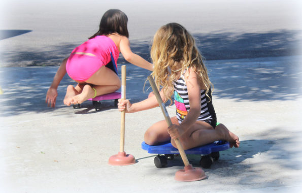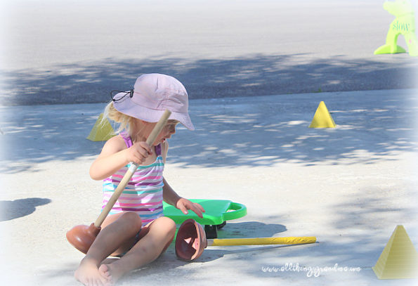 These stores have everything I need for fun and games. The grandchildren already knew about the scooters. They didn’t come from the dollar store. They said they had them in their classrooms. I bought plungers for $1 and sand toys in yellow and orange which looked like cones. Grandpa laid out a race course on the driveway and kids raced each other. (It helps to live in a quiet cul-de-sac)