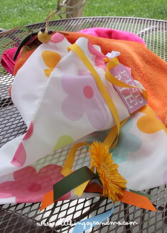 No kidding.  This is a 15 minute swimming bag.  It is made from a shower curtain.  Not an expensive shower curtain but a $5.99 shower curtain on the discount table.