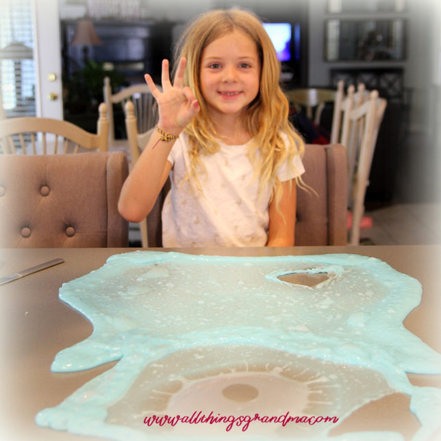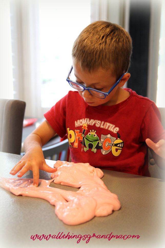 At first I had them play with their slime on cookie sheets. Soon we all realized that it was more fun to play with slime right on the counter which has a glossy finish and was perfect. The slime just slid around and picked right up anywhere there was a blob.