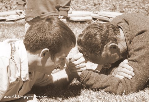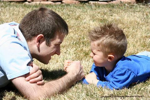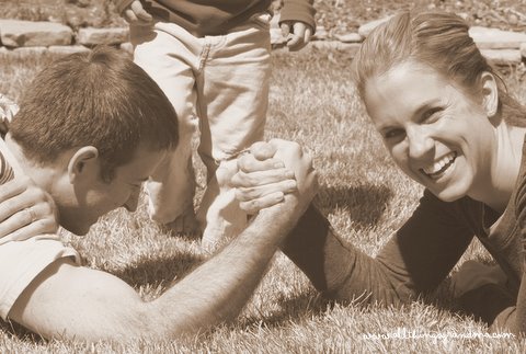 It was time for the arm wrestling contest. Everyone took turns. It was Holden’s turn. He was sure he could beat Uncle Dan. He had really strong muscles. We all felt them. They assumed their positions on the grass. Holden got a good grip. Both of them grunted and groaned but . . . in the end . . . Holden was right. He had REALLY strong muscles. Uncle Dan was a very gracious loser !