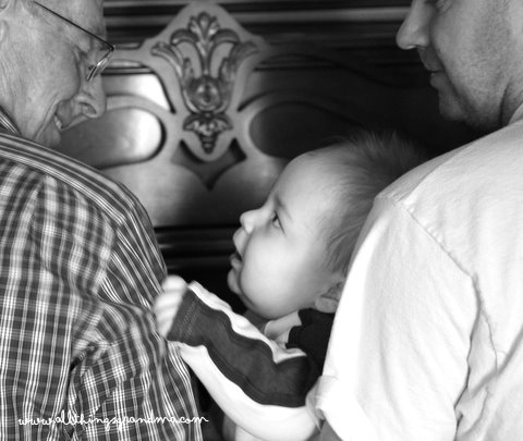 When taking family pictures I prefer the sneaky kind. If no one knows I am watching them, they won’t smile funny. If these three generations were lined up, looking at me, I would not have liked the photograph as well as I do. The three . . . grandpa, grandson and father are sitting at the piano. At first, little Andrew was preoccupied with the sound of the piano keys. Then, he discovered his grandpa’s face and things changed. I love photographs which will touch my heart many years from now.