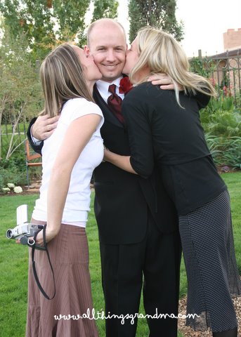 It is hard to believe that these three were once little people, racing around the house with two additional brothers, chasing each other and running away from Dan. Today they are celebrating a marriage. The marriage of one of the nicest people they know. Their brother. A surprise kiss and hug from two sisters who love their brother. I really was quite far away but close enough to catch his blush !