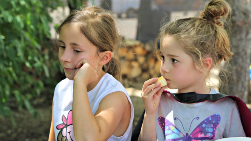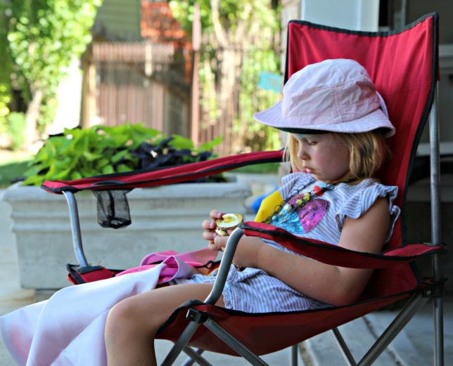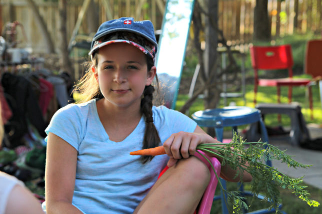 I saw Lydia wear two hats in a pink chair while eating a carrot from the garden.
