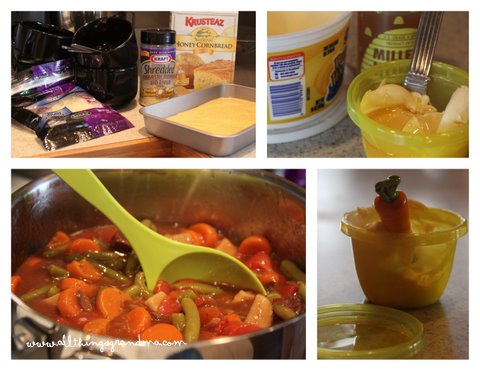 Mix the stew ingredients together in a large sauce pan.   Make the corn bread according to the package. (About 24 minutes cooking time.) Heat the stew while the corn bread is cooking.  Put the margarine into a small container.  Add the honey.  Mix with a fork until blended.   Dish out the stew and top with cheese.  Either use Parmesan if you have it or frozen, shredded cheese if you have it.  If you don’t have either, don’t worry about it.  Six bowls, six spoons, six little plates, six knives and six cups for the milk.  Yes. Milk.