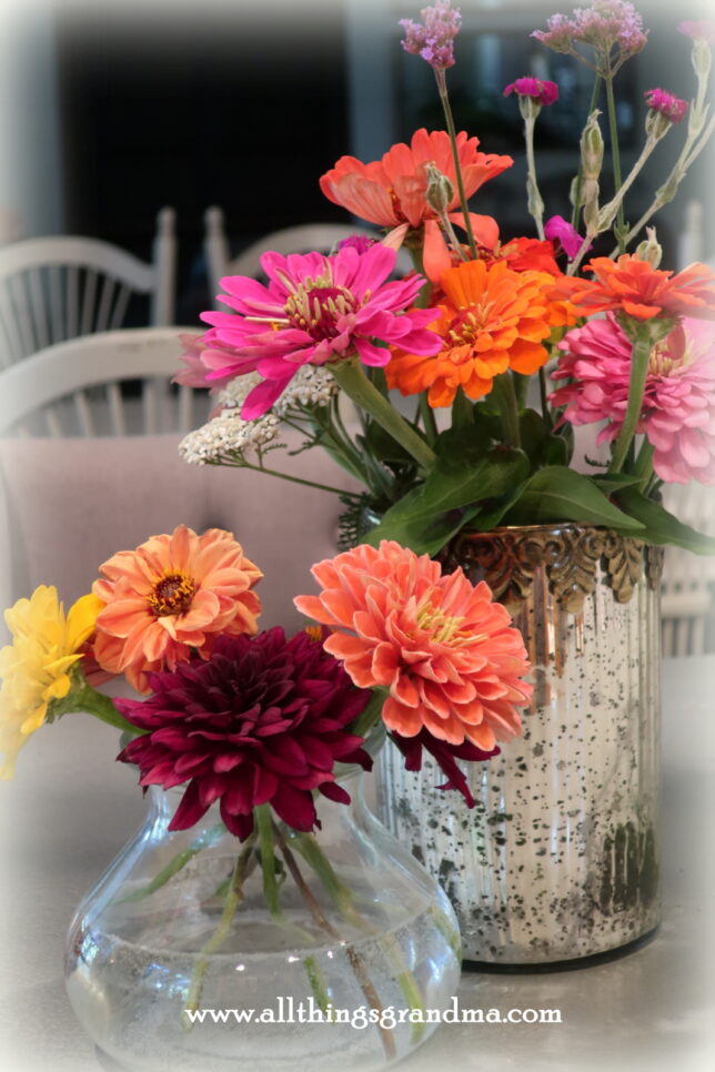 I snipped here and there around the yard. In the small vase are the salmon and dark purple Dahlias, along with the Zinnias.