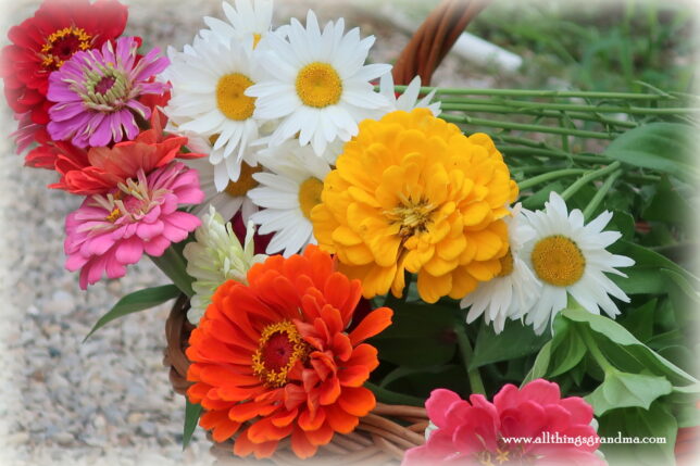 Many other favorite cutting flowers are also profuse at the same time like daisies and bachelor buttons and some kinds of yarrow. Also in the row with the zinnias we plant a few Dahlias. They come in lots of colors.